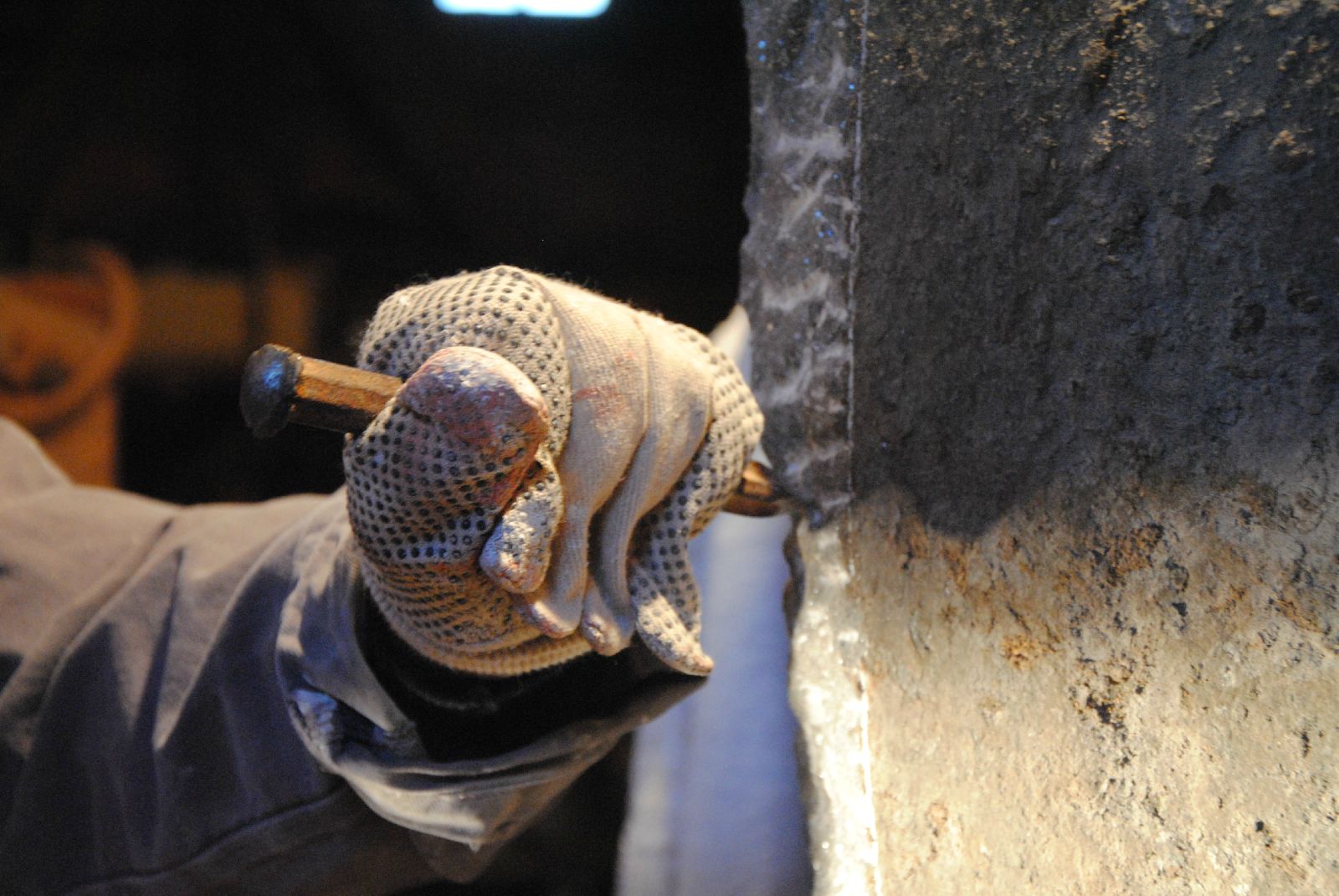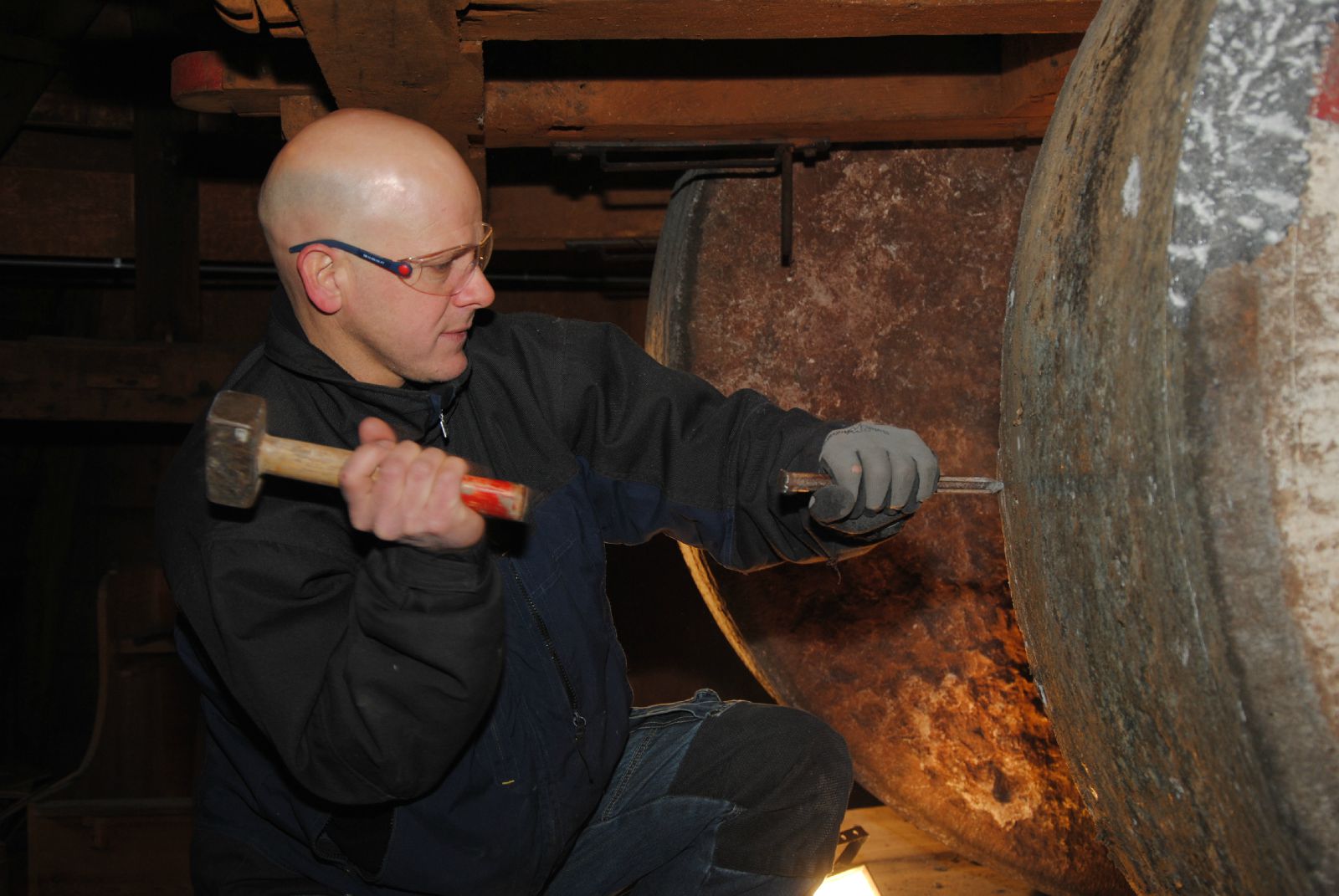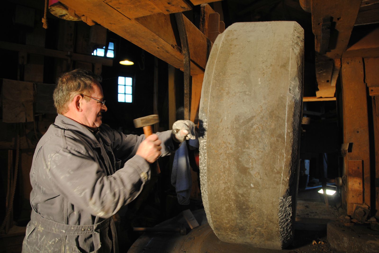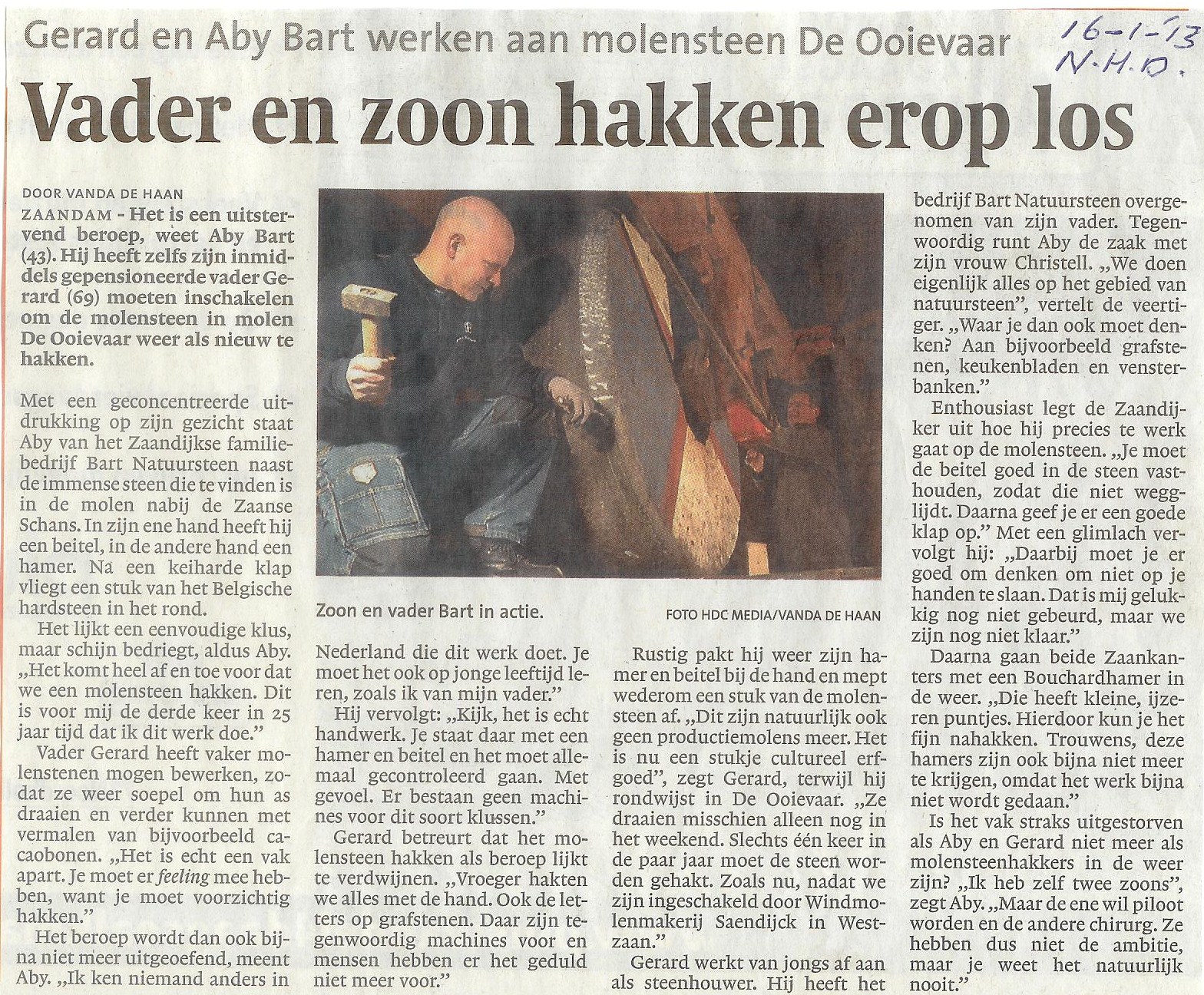 Vader Gerard en zoon Aby Bart van Bart natuursteen hakken vellingkanten aan de kantstenen van oliemolen De Ooievaar.